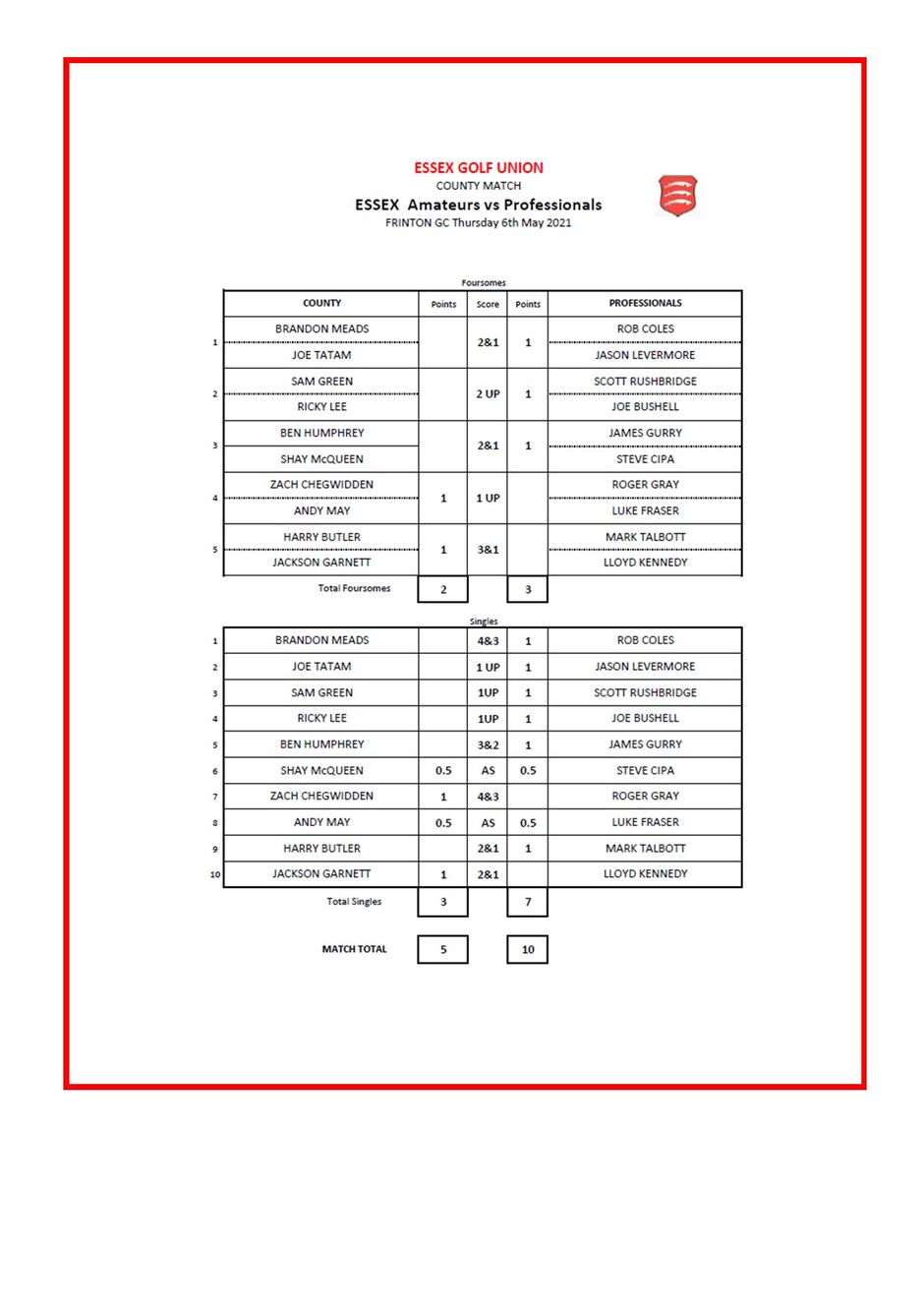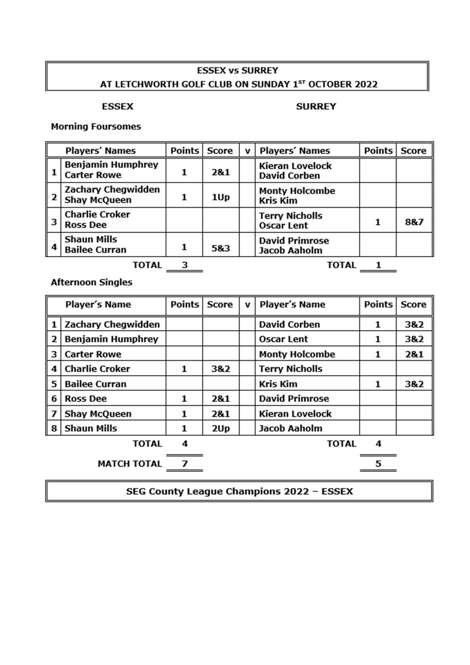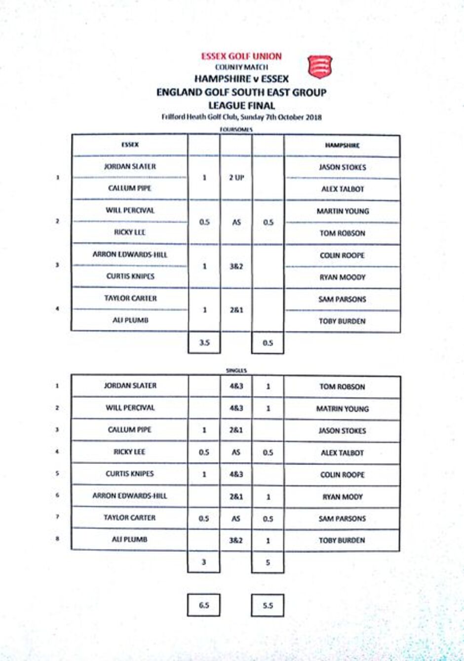 Into the afternoon singles, Jay Beisser raced out of the blocks and secured a 6&5 victory for Essex ahead of the first three matches. Mitch Sarling lost 3&2 and Andy May finished soon after, with a 3&2 victory. Joe Dobbyn finished soon after with a 6&5 loss and then Ollie Allison finished with a 3&1 victory.