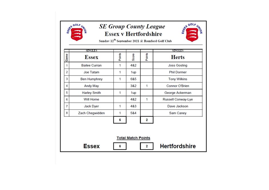 A bright late August morning greeted Essex and Hertfordshire at Chelmsford GC for what was set to be a close encounter with the winners assured of becoming SE Group North Division League champions. The foursomes were led off by Andy May and team captain Ben Humphrey who were always ahead and secured a comfortable point for the home team, in match 2 Shaun Mills and Bailee Curran were always behind but made a brave effort before losing on the 18th green. Matches 3 & 4 also went our way to give us a 3-1 lunch time lead.