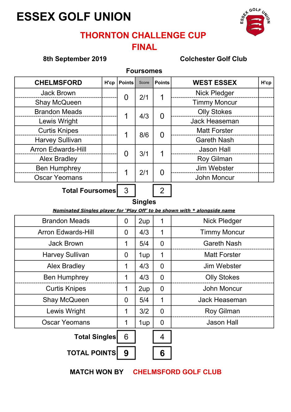 Chelmsford managed good wins from Jack Brown, Alex Bradley, and Ben Humphrey to swing things back in their favour, only for Matt Forster to birdie the 18th for a narrow 1up victory and Jack Heasman to seal a good 5&4 win to put the tie in the balance at 6 points each, with three matches left on the course.