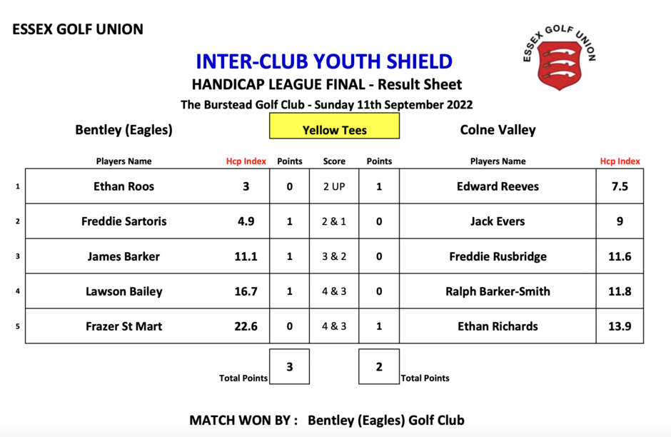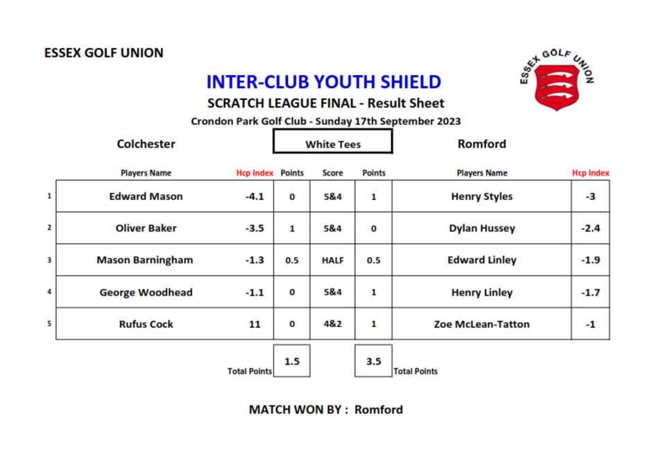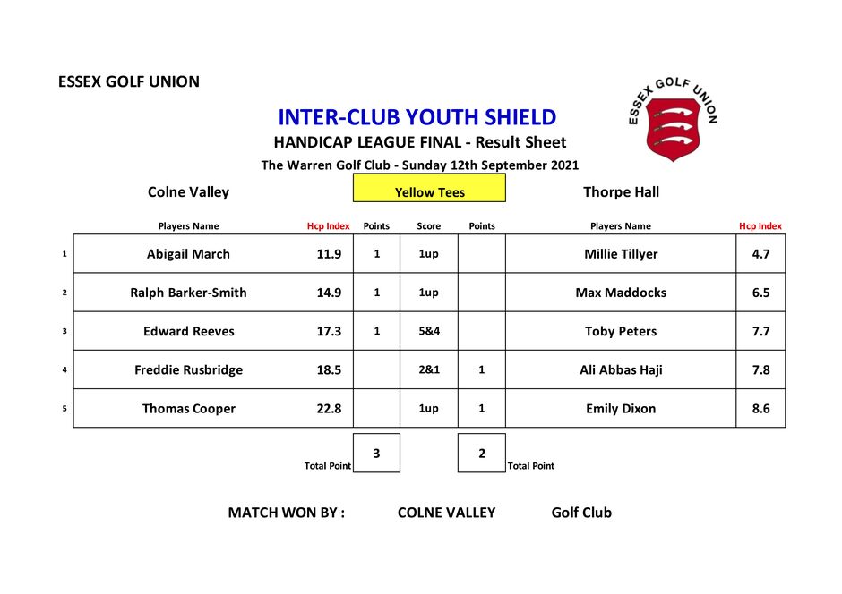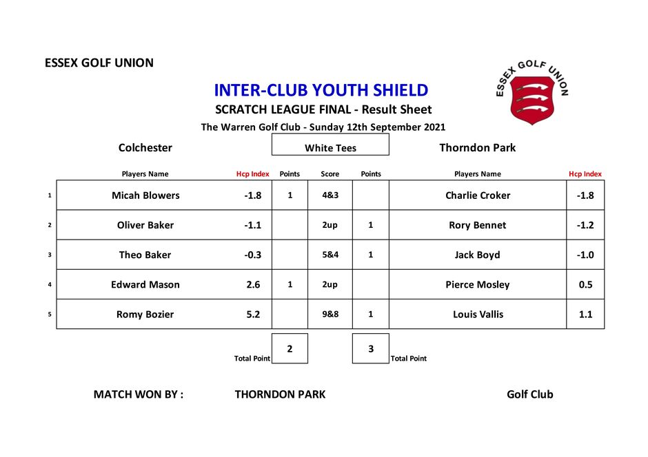 The 2021 Youth Shield final was played at The Warren Golf Club on Sunday 12th September with Thorndon Park playing against Colchester.