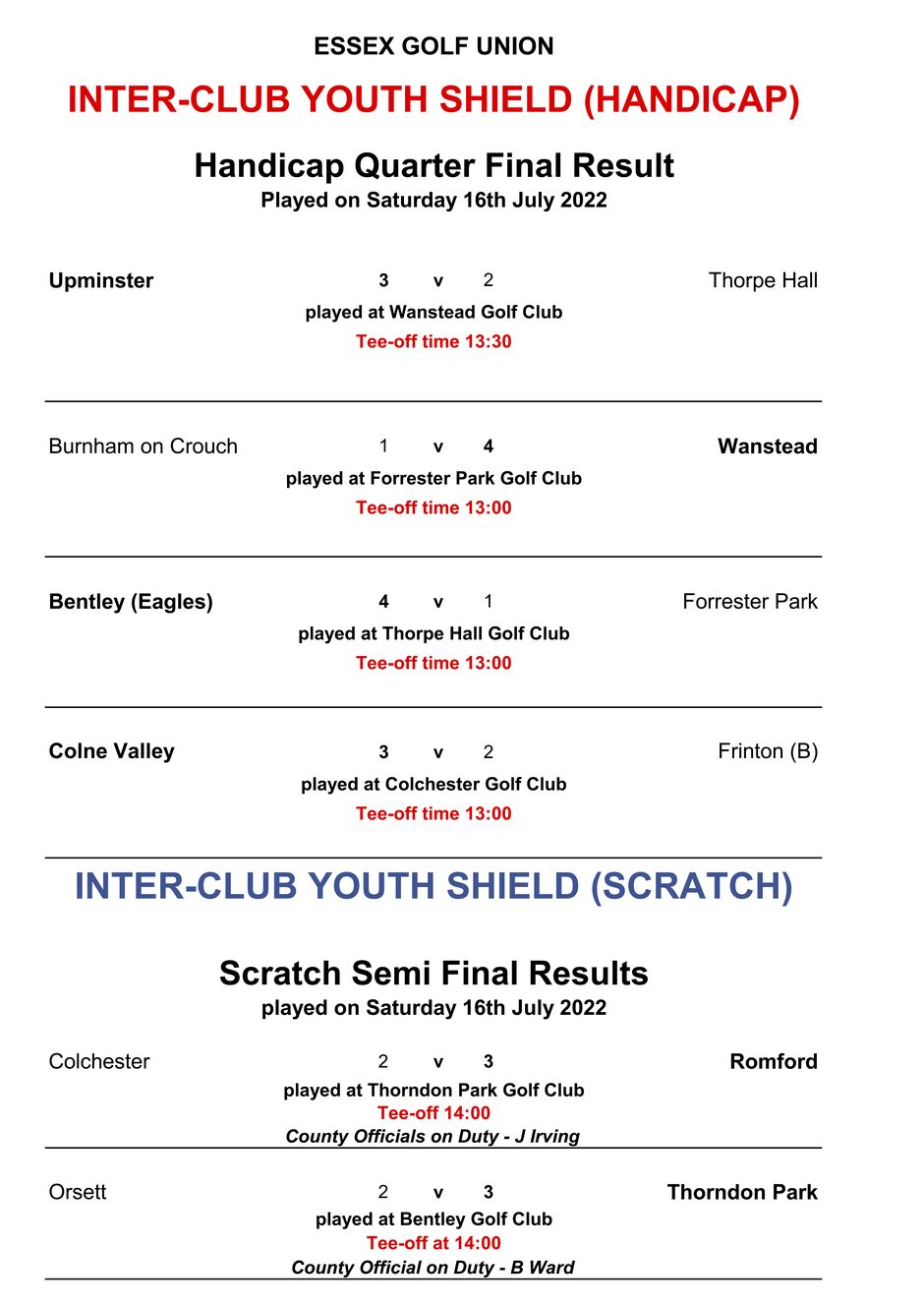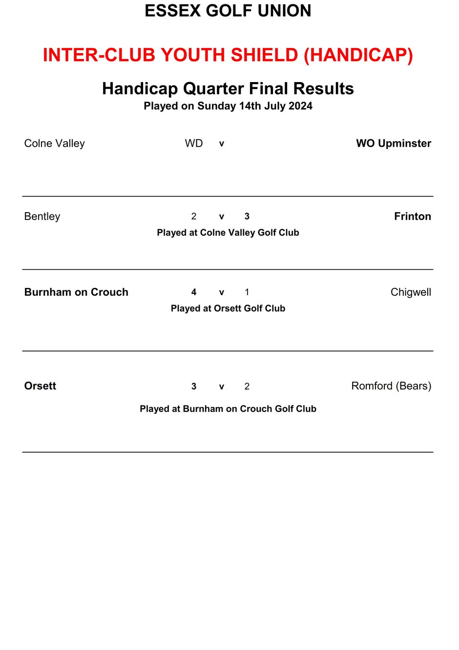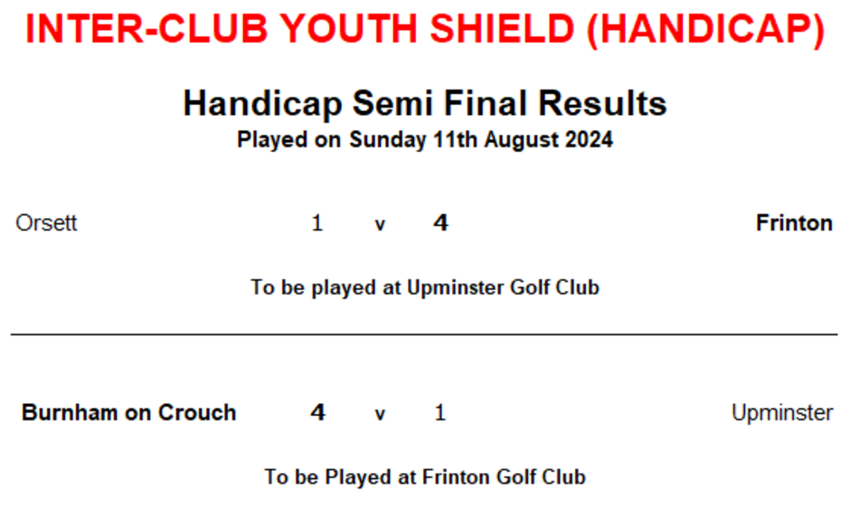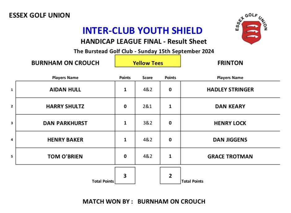 INTER-CLUB YOUTH SHIELD (HANDICAP)FINALBurnham on Crouch v FrintonHosted by Brentwood Golf Club Sunday 15th September 2024