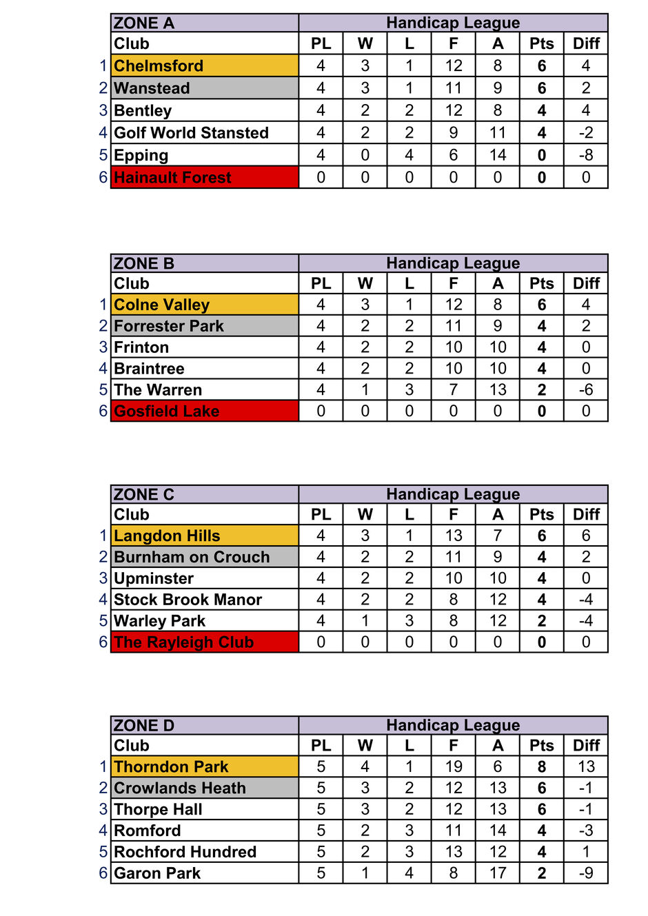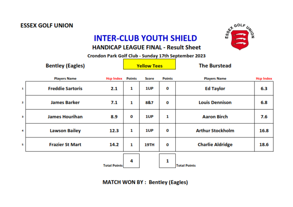 The Handicap League saw a return to the winner's circle for Bentley (Eagles) also. With 3 players retained from last year's final, Bentley were made to work hard by their opponents, The Burstead. In all but one match the difference was only a hole! The final score 4-1.
